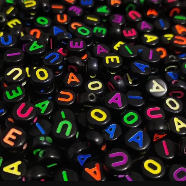 Seja o primeiro a avaliar “200 MIÇANGAS LETRAS REDONDAS VOGAIS 4X7MM ( AEIOU ) PRETO/ COLORIDO 30G”